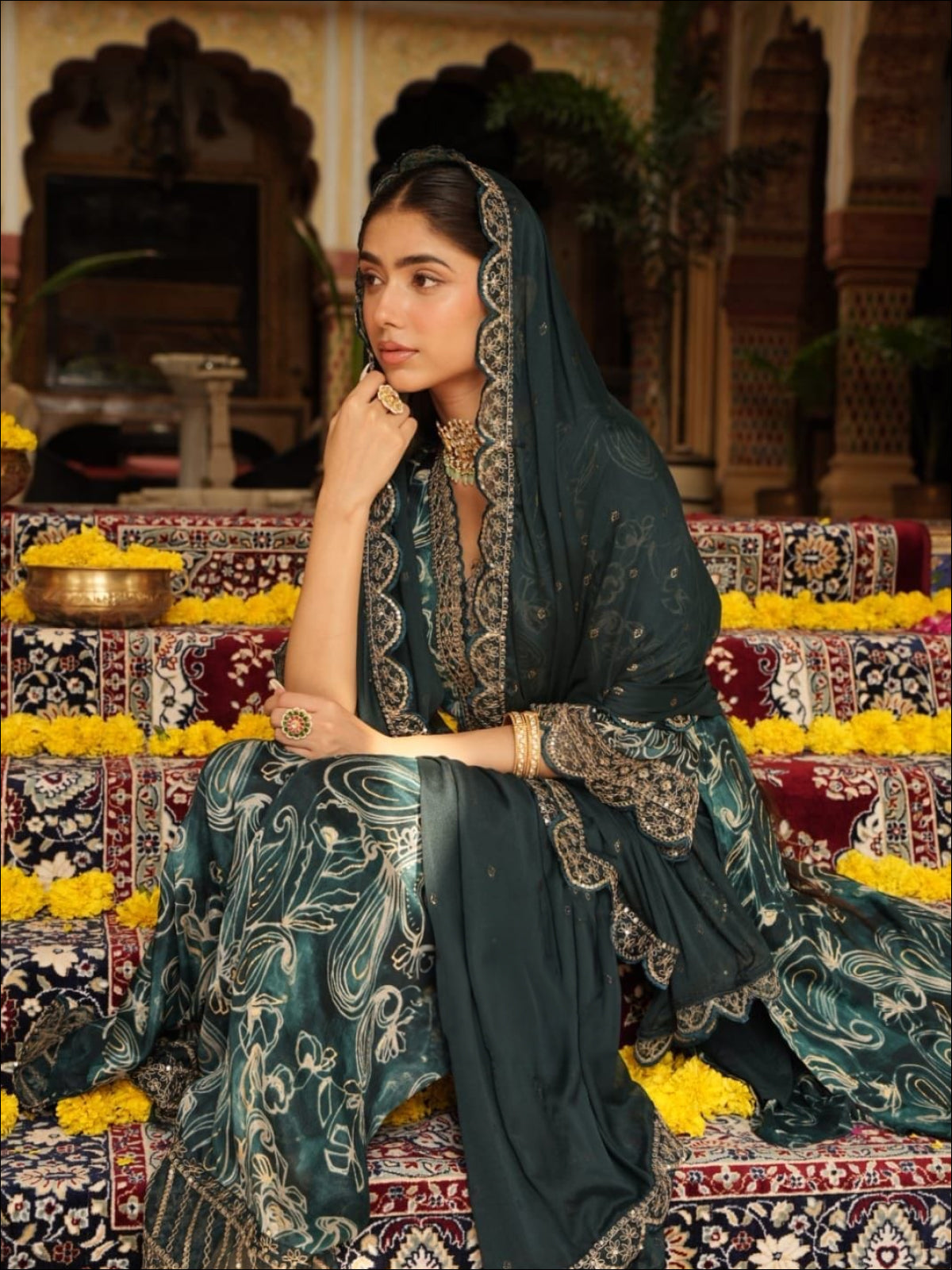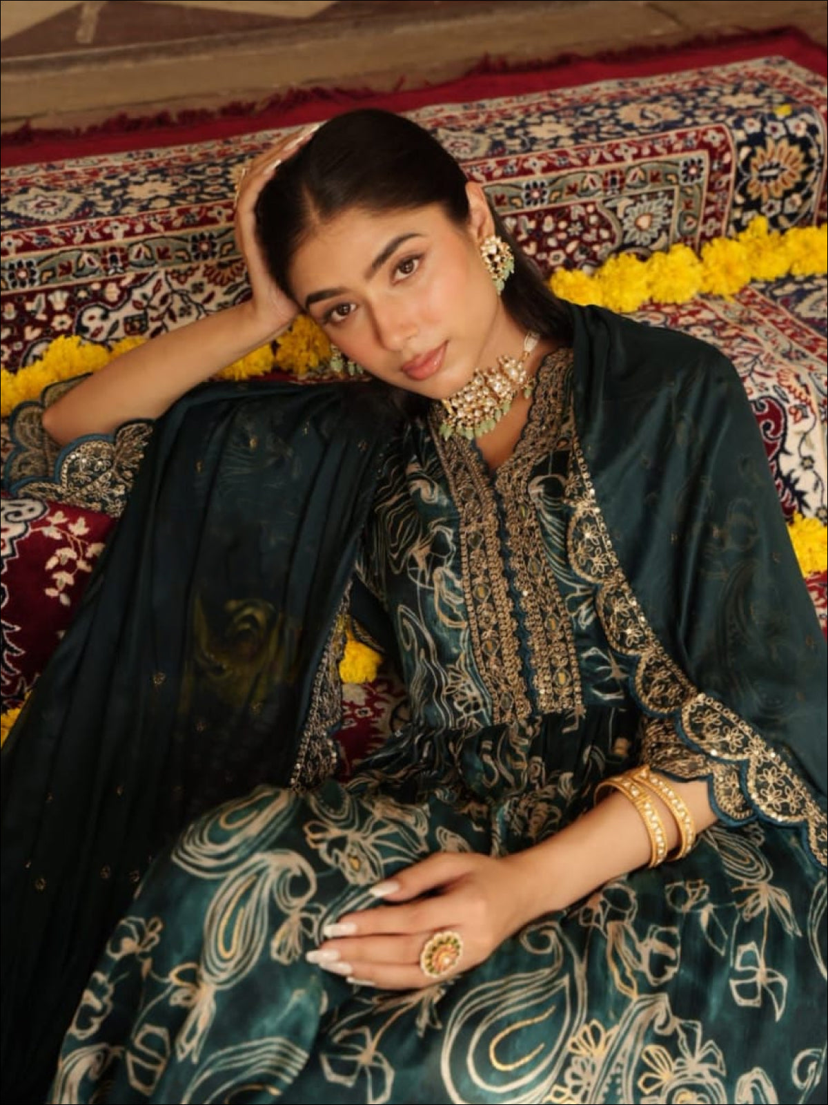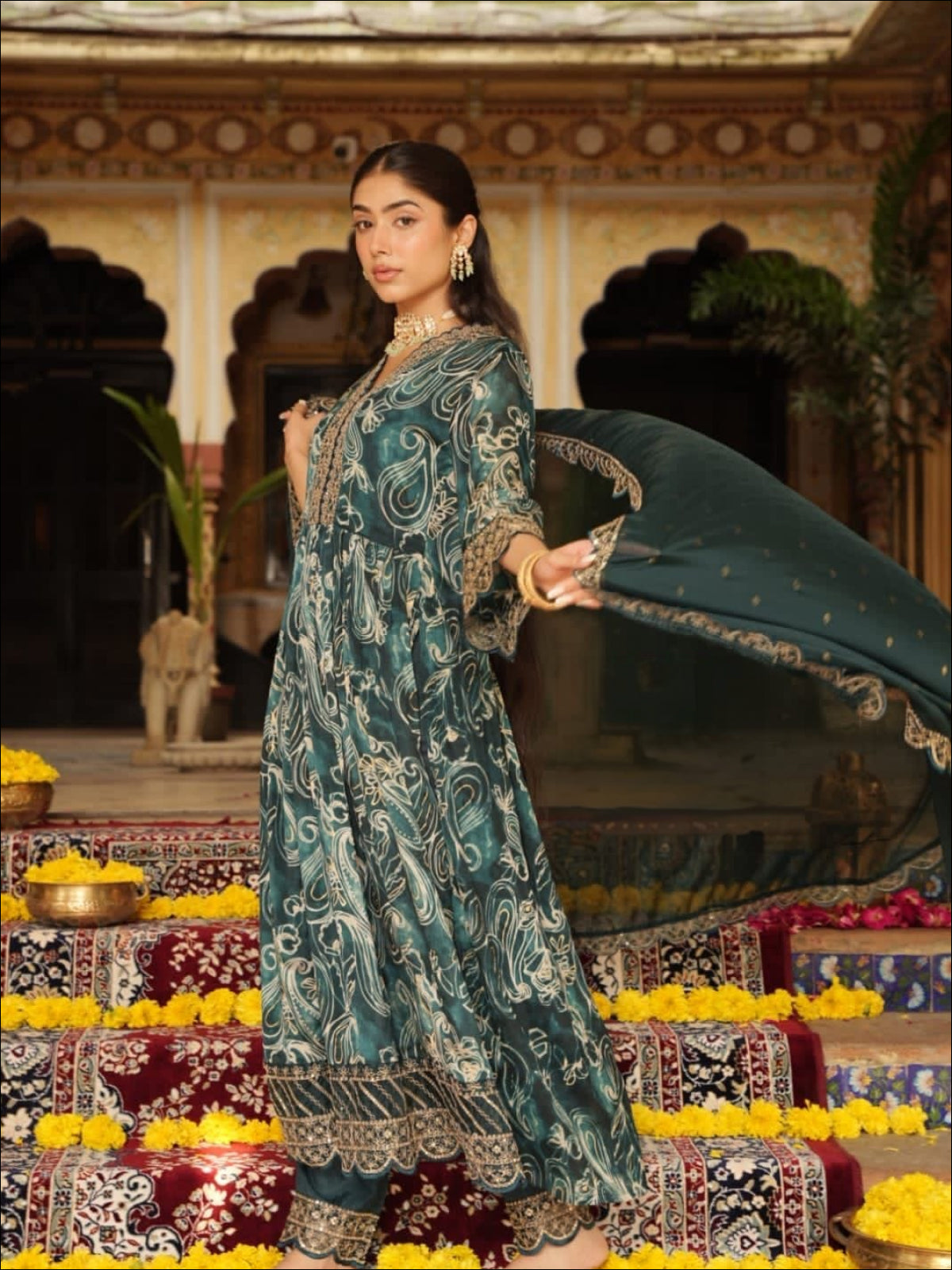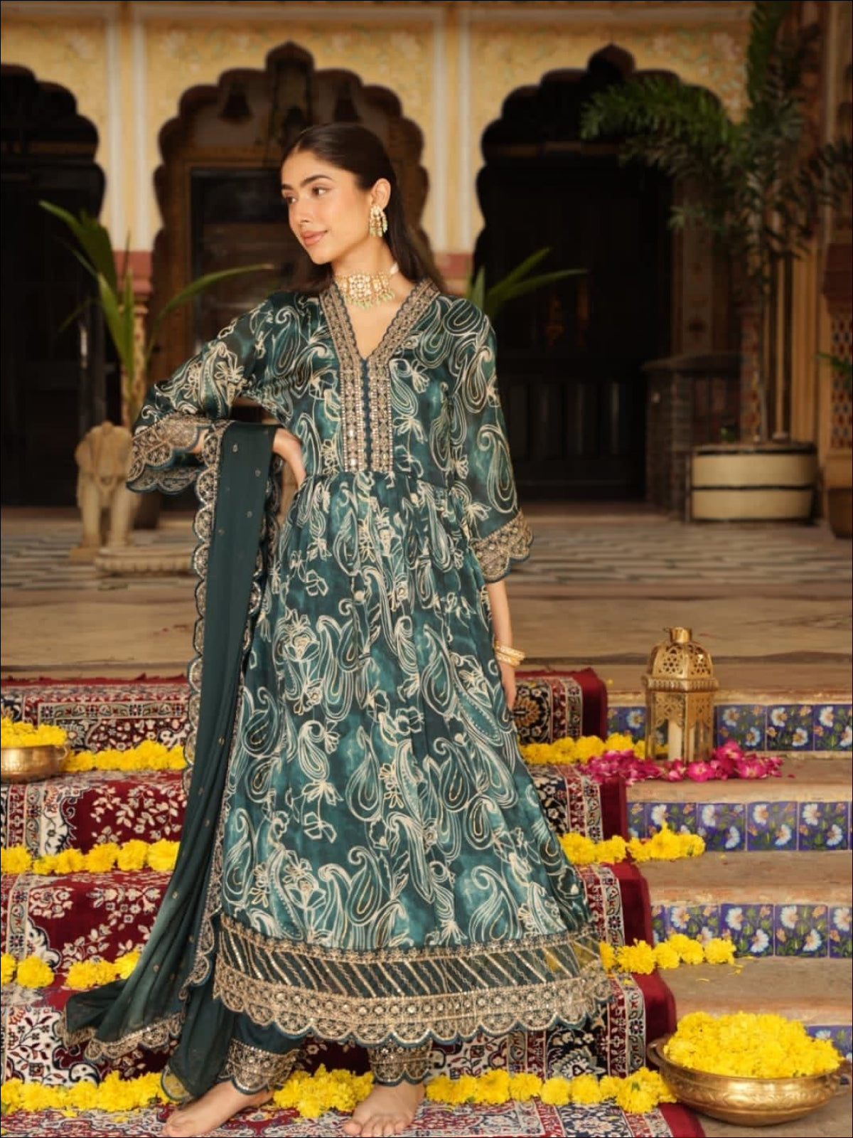 Pure chinnon paisley abstract printed kurta with heavy work..(lining attached on yoke), paired with silk pants with embroidery and chinnon dupatta with cutwork borders..